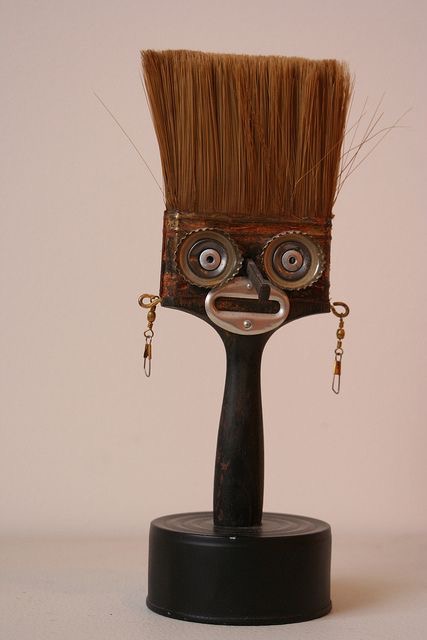 I have a recent growing interest in altered art. In particular altered paintbrushes. I’ve used brushes in my work a few times, and I’ve always felt that used paintbrushes have an unseemly and sad ending in their lives. It’s an attachment that I feel to a particular brush that wears just how I like, or applies paint in the exact right way. I know other artists out there understand exactly what I mean. The brush is an extension of your hand which is controlled by your mind, emotions. I think it’s very reasonable to get attached to your brushes or any other tools you use. I know that athletes feel the same way about their gloves and bats, and mechanics about their tools.